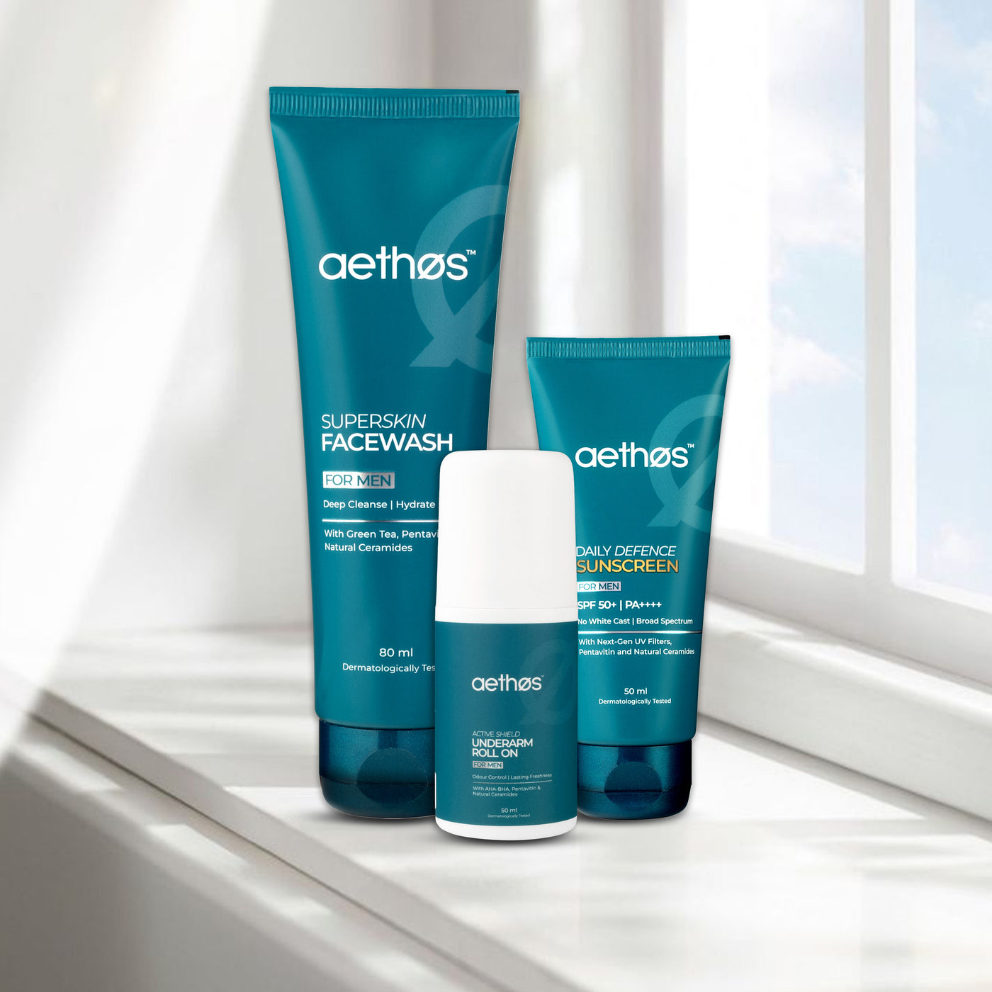 Aethos Daily Defence Sunscreen offers broad-spectrum UV & pollution protection while boosting hydration and glow with Next-Gen UV Filters, Niacinamide, Vitamin C, and Natural Ceramides.