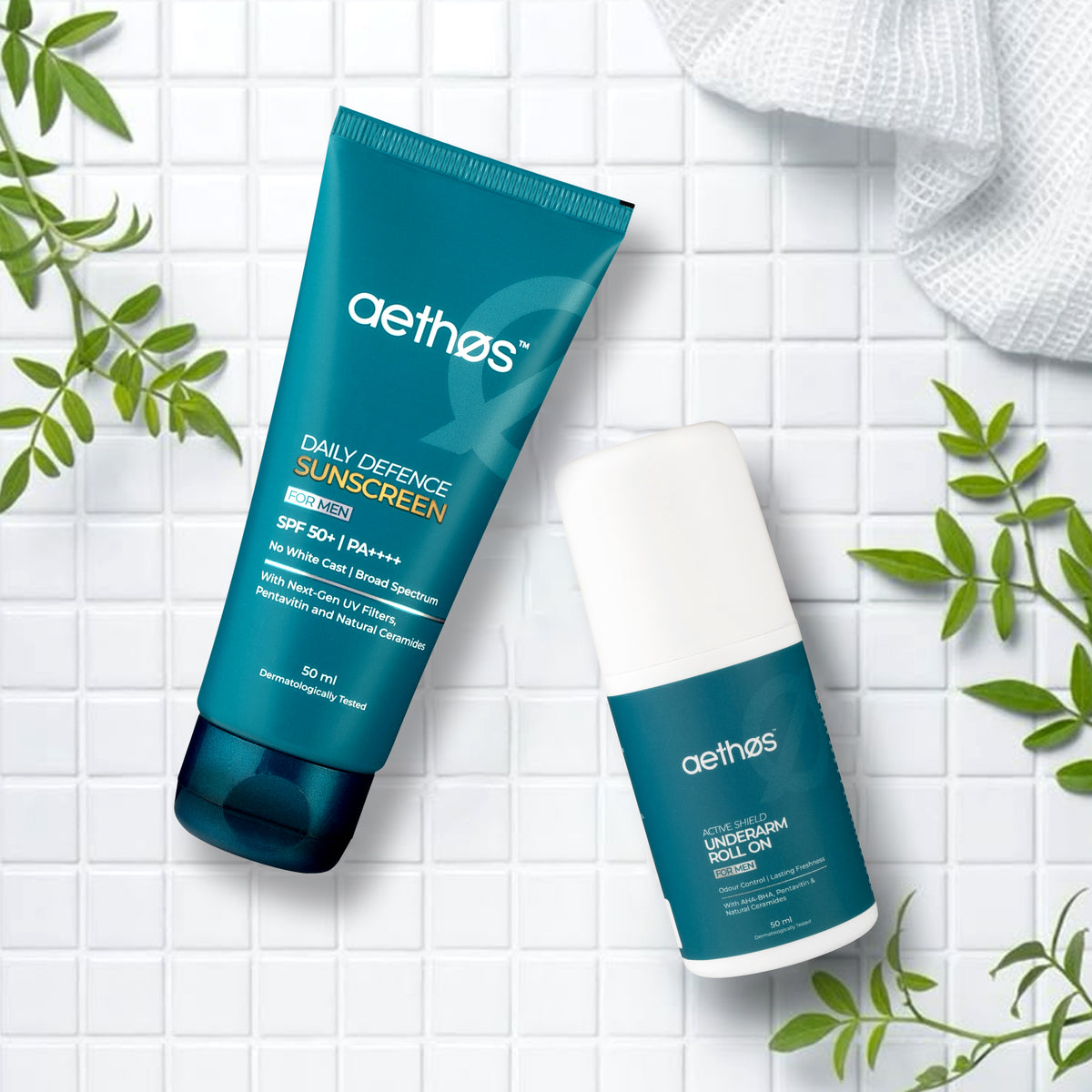 Aethos Daily Defence Sunscreen offers broad-spectrum UV & pollution protection while boosting hydration and glow with Next-Gen UV Filters, Niacinamide, Vitamin C, and Natural Ceramides.