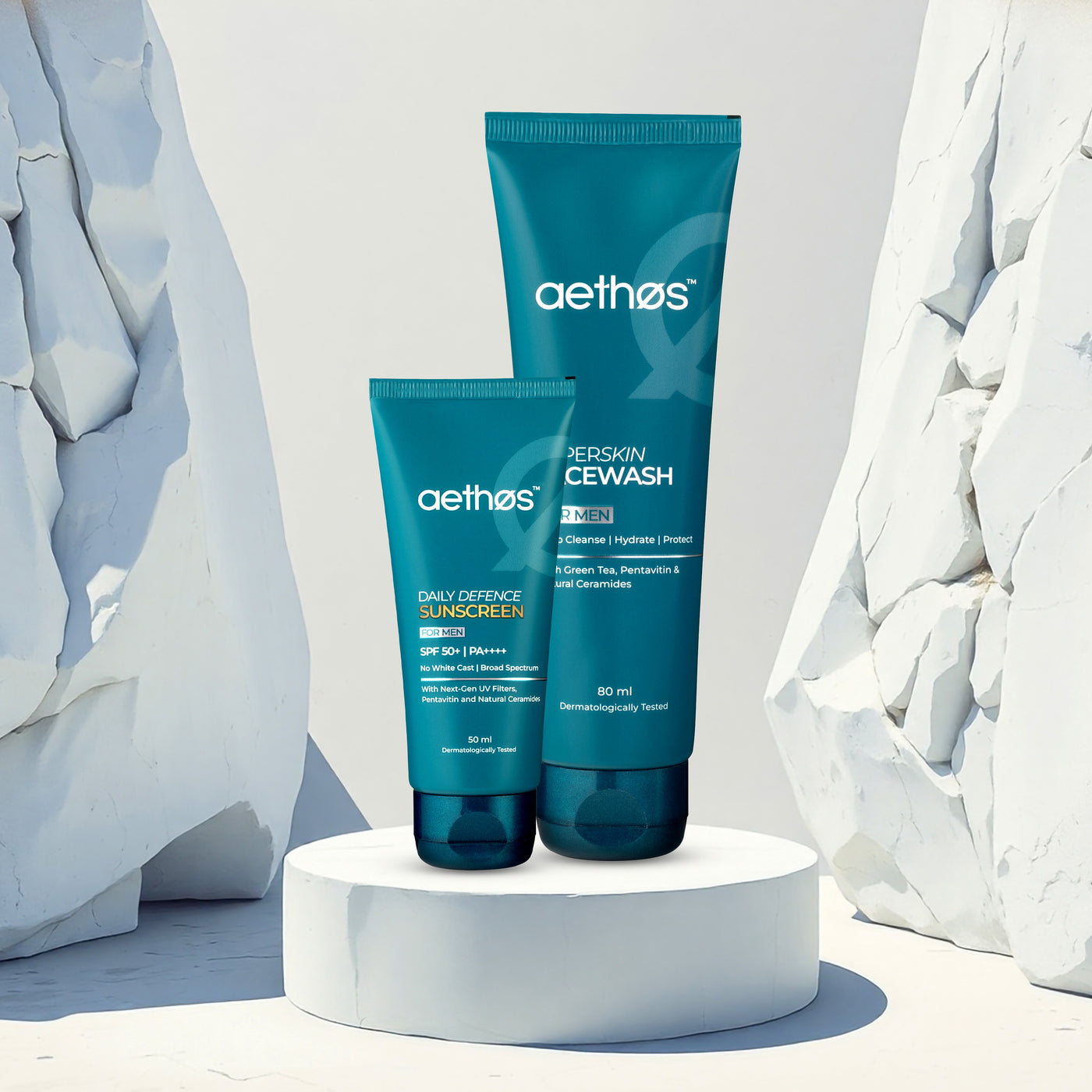 Aethos Daily Defence Sunscreen offers broad-spectrum UV & pollution protection while boosting hydration and glow with Next-Gen UV Filters, Niacinamide, Vitamin C, and Natural Ceramides.