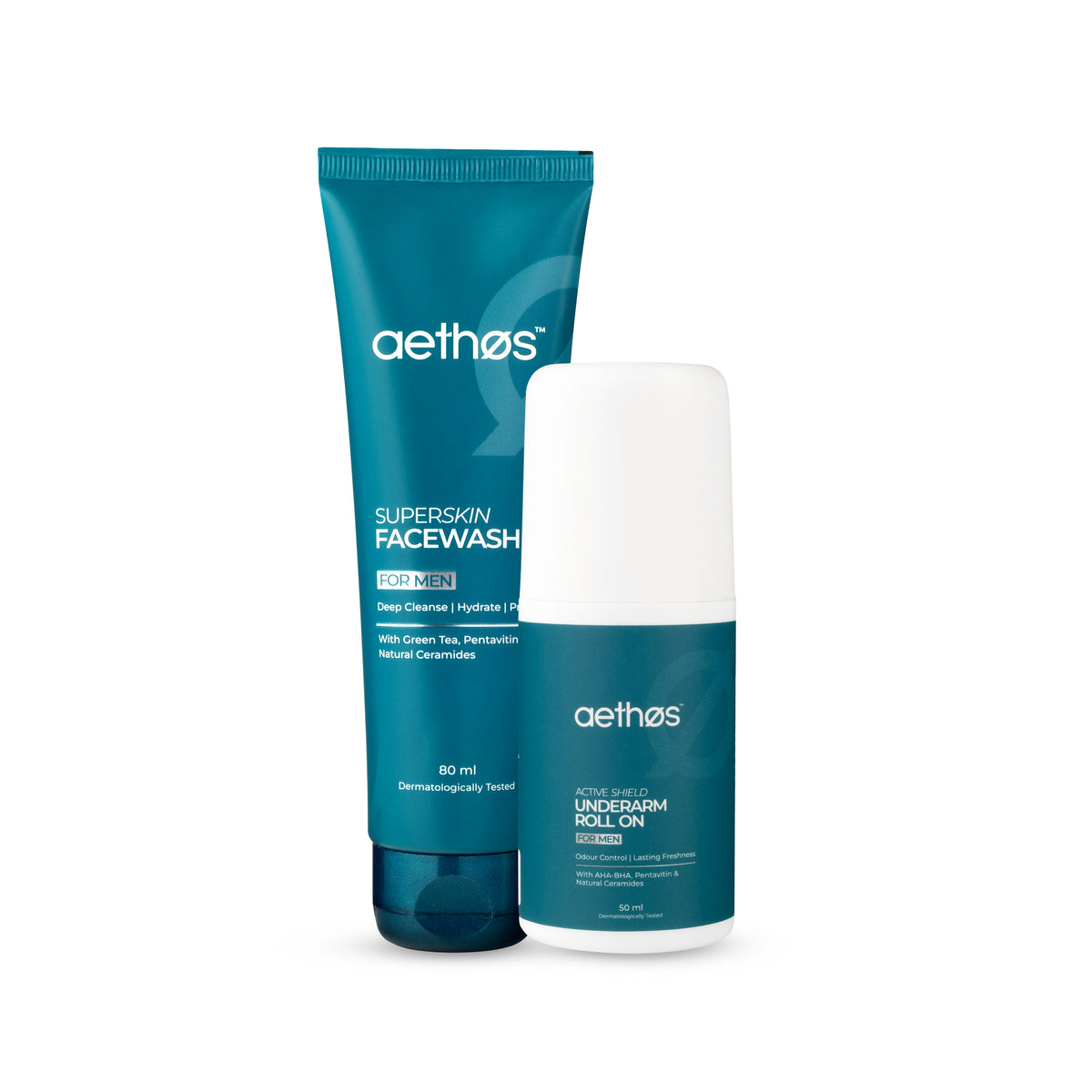 Aethos Active Shield Underarm Roll On tackles odour and sweat with AHA-BHA, soothing Allantoin, Vitamin B5, and lasting moisture-locking actives.